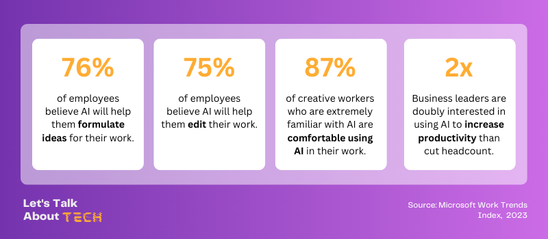 Turns out that although almost half (49%) of the surveyed employees are worried AI will replace their job, even more (70%) are willing to delegate as much work as possible to AI as a means to reduce their workloads.